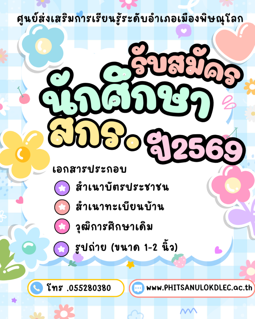 ประกาศรับสมัครนักศึกษาใหม่ ภาคเรียนที่ 1/2569 สกร.ระดับอำเภอเมืองพิษณุโลกby adminข่าวประชาสัมพันธ์, ประกาศกรมส่งเสริมการเรียนรู้เมษายน 1, 2025ธันวาคม 26, 2025 นักศึกษาดาวน์โหลด ใส่ความเห็น ยกเลิกการตอบอีเมลของคุณจะไม่แสดงให้คนอื่นเห็น ช่องข้อมูลจำเป็นถูกทำเครื่องหมาย *ชื่อ * อีเมล * เว็บไซต์ ความเห็น * บันทึกชื่อ, อีเมล และชื่อเว็บไซต์ของฉันบนเบราว์เซอร์นี้ สำหรับการแสดงความเห็นครั้งถัดไป nextการปฐมนิเทศ นักศึกษาสกร.เทียบวัดระดับความรู้การศึกษาขั้นพื้นฐาน ภาคเรียนที่ 2 ปีการศึกษา 2568